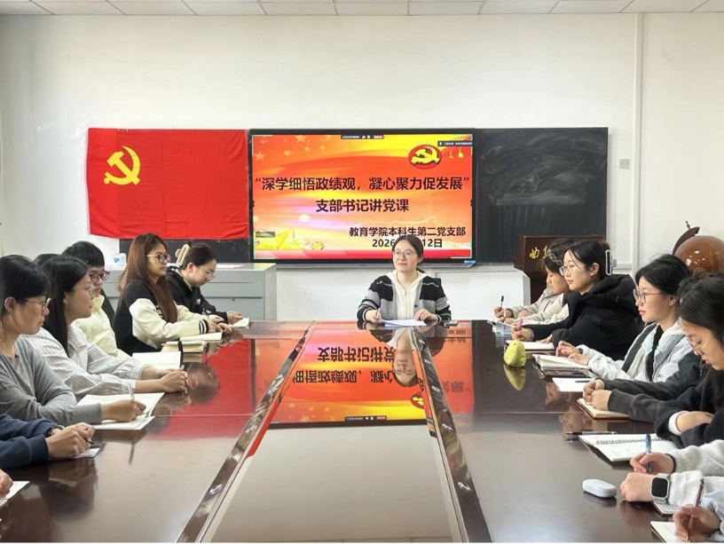 本科生第二党支部书记张东霞于教育北楼305会议室,以“深学细悟政绩观,凝心聚力促发展”为题,为支部党员讲授树立和践行正确政绩观学习教育专题党课。