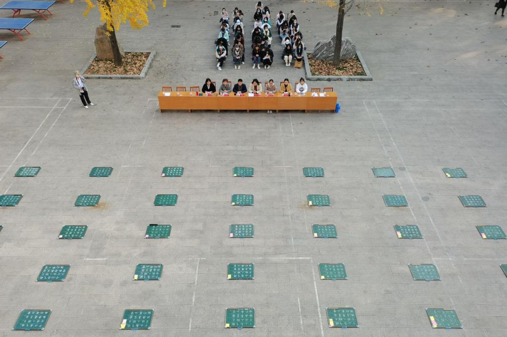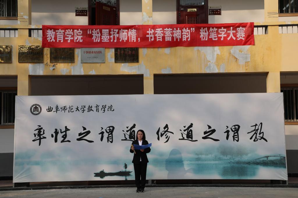 楼前举办“粉墨抒师情,书香蓄神韵”粉笔字大赛。学院党委副书记孙超出席活动,团委书记周长缨,辅导员王保英、张东霞、商雪敏参加活动。本次比赛特邀书法学院徐可然老师,兰亭书社社长李思娜和部分社员担任评委。