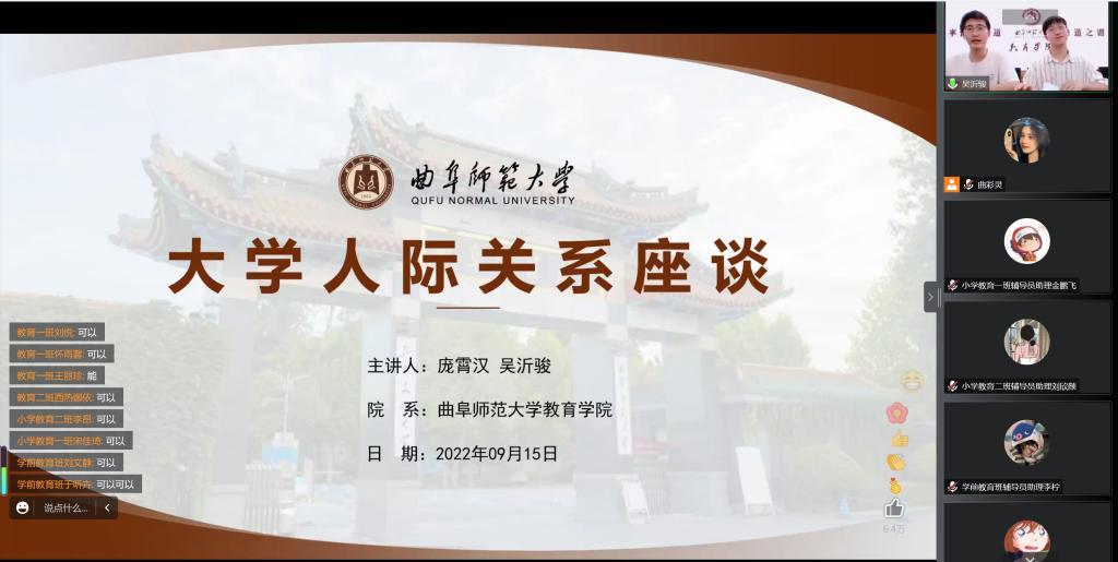 9月15日,在“大学生人际关系座谈”中,黑料不打烊 学生会原主席2019级学生庞霄汉、原副主席吴沂骏同学,与2022级新生齐聚线上,结合自身学习生活体会,介绍了大学生在宿舍里如何与舍友相处、在学生会中如何与老师和同学相处,以及大学生的恋爱问题。讲座氛围轻松活泼,同学们在评论区讨论热烈,纷纷表示听了讲座后收获了很多人际交往的小技巧。