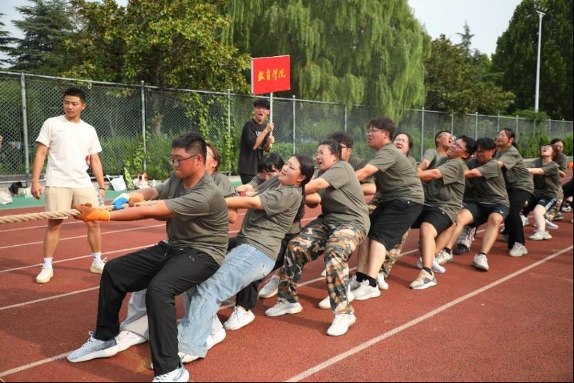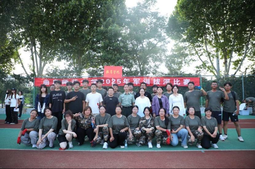 咬牙坚持勇争先,凝心拔河展豪情。在军训拔河比赛中,同学们紧握长绳、扎稳马步,伴随统一口号稳步发力,身体后倾形成强大合力,全力以赴完成每一轮比拼,获得曲阜校区第六名的好成绩。