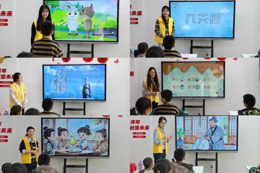 本次读书分享会以“多维阅读猜猜乐”开场,学员们采用“游戏化+情境化”的教学方式,通过图片引导社区孩子们学习孔融让梨、乐善好施等中华美德相关成语故事,结合动画视频,加深孩子们对“见贤思齐”“克己复礼”等美德认知。“故事表情大冒险”互动游戏中,学员带领孩子们通过表情模仿,把抽象的美德理念转化为直观可感的生动体验。