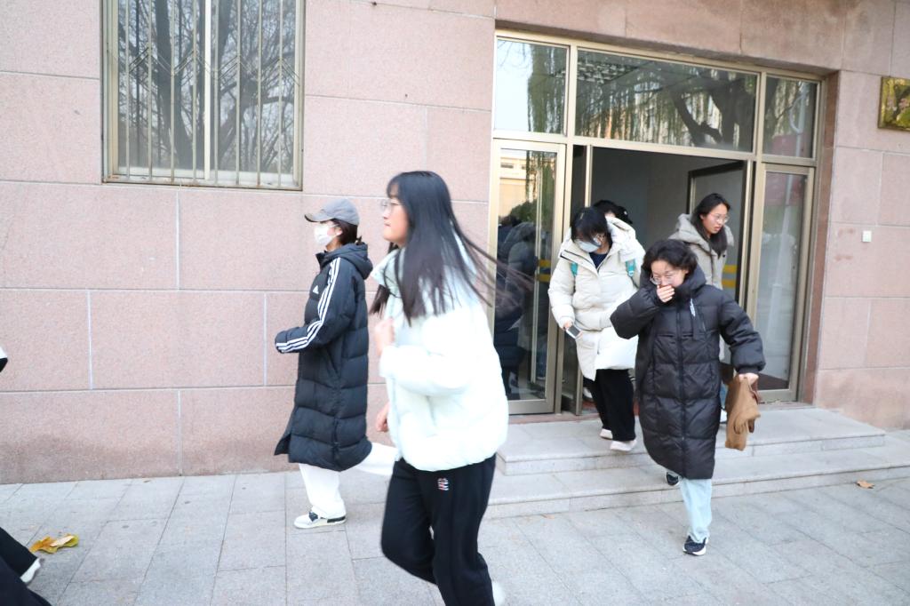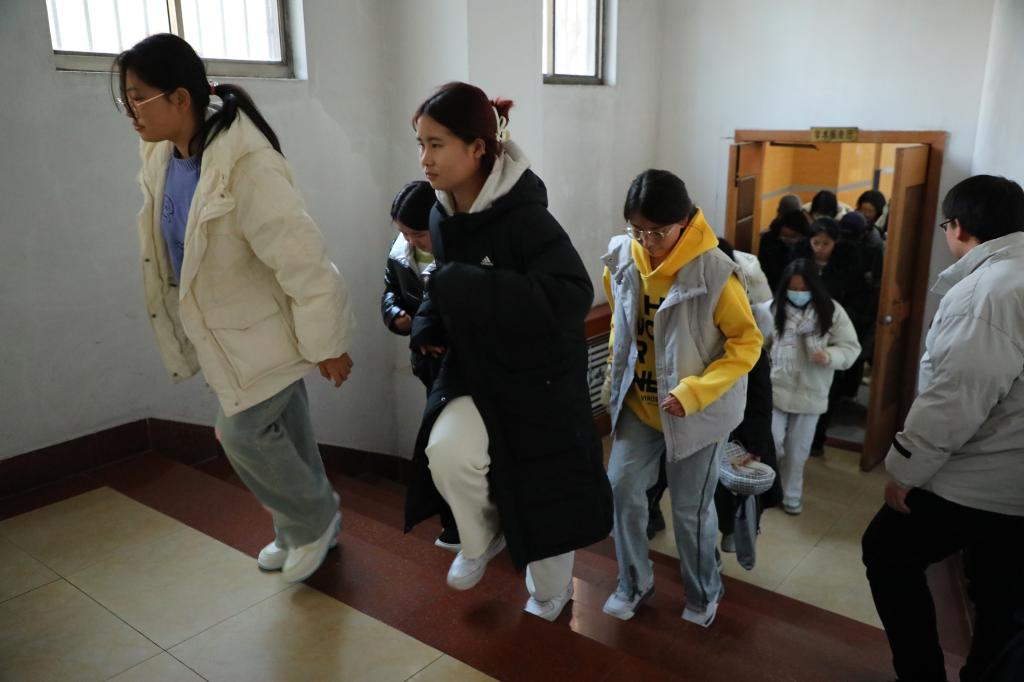 培训结束后,应急疏散演练正式开始。随着火情警报响起,师生们在会场内迅速响应,老师立即到达指定岗位,引导不同座区的同学们依照既定路线有序疏散。同学们弯腰低头,快步急行,严格做到不奔跑、不推挤,始终保持着良好的秩序,快速且安全地撤离会场抵达集合区域,展现出良好的纪律素养和应急能力。