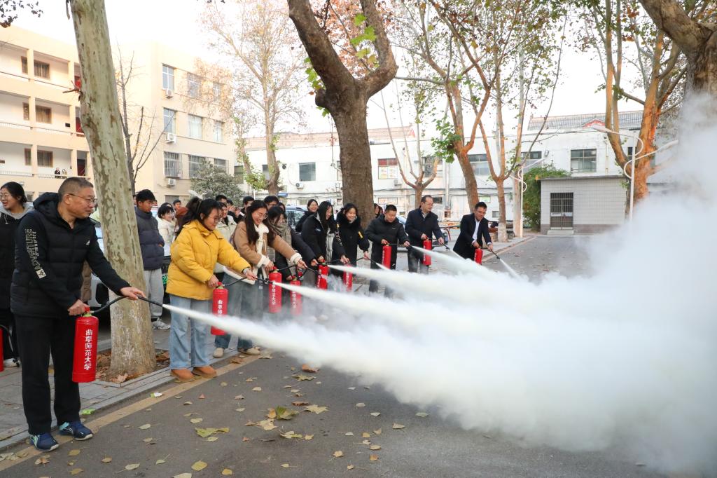 在灭火实操演练环节,刘淑朋老师向大家现场演示灭火器的实操细节,讲解注意事项。随后,学院领导和师生代表在刘淑朋老师的指导下,按照“一提二拔三对四喷”的常用手提式干粉灭火器使用方法,依次有序地拿起灭火器成功扑灭燃烧的火苗。整个演练过程中各方配合默契,现场组织有条不紊,达到了预期效果。