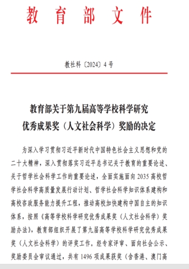 教育部人文社科奖于1995年首次设立,是目前我国人文社科领域最具公信力和权威性的重要奖项,也是我国人文社科类成果的最高奖项,旨在表彰在高校人文社会科学研究中做出突出贡献的研究人员,展示高校人文社会科学界服务党和国家事业发展的重大理论与实践成果,推动高校哲学社会科学高质量发展。