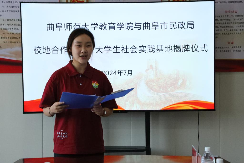 仪式上,孙超与曲阜市民政局党组书记、局长许鹏共同为大学生社会实践基地揭牌。