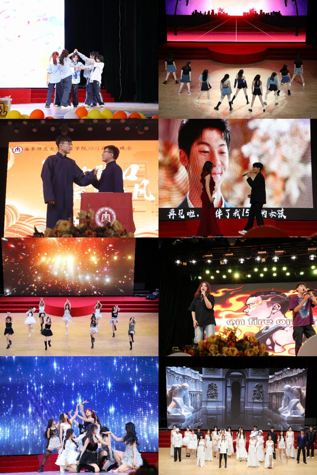 充满青春力量的《初次见面并不按计划进行》舞蹈开场,带动全场氛围;舞蹈《Yonce》、rap《Burn me down》等节目活力四射,嗨翻全场;相声《礼仪漫谈》、小品《高情商心眼子大赛》等节目逗乐观众,精彩纷呈。原创情景剧《???》以新闻播报的模式,于欢笑声中回忆过往四年,学生代表共同亮相送出毕业祝福。最后在舞蹈《童年拾忆》、《送别》的渲染下,离别的氛围渐浓,毕业生们回忆童年,回首过往,感慨时间飞逝,感恩母校的培育。随后,学院领导老师们在毕业寄语视频中表达了对2024届毕业生们的殷殷期望与美好祝愿,时光漫漫,我们终会再遇见。