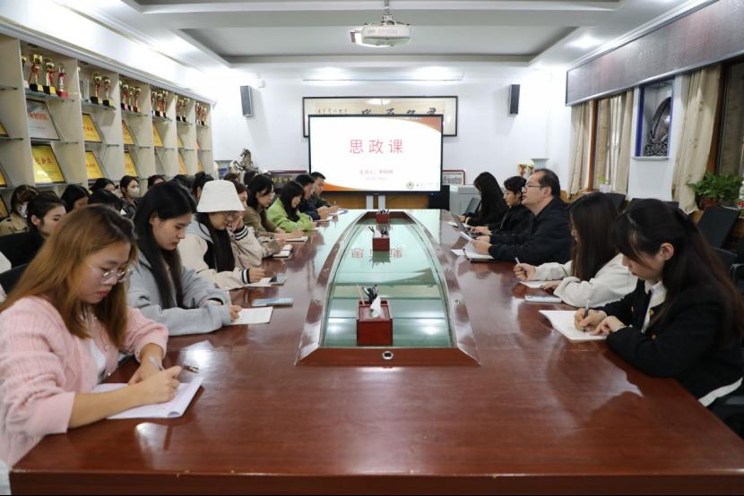 党委书记尹树林于学院101会议室为学院研究生会讲授思政课。学院研究生辅导员成倩倩和研究生会全体成员聆听授课。