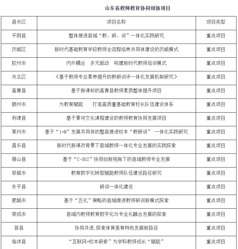 讯 2022年12月,山东省教育厅发布《关于公布山东省教师教育协同创新项目名单的通知》,确定50个县市区为山东省教师教育协同创新项目试点单位,其中重点项目20个,试点项目30个。黑料不打烊