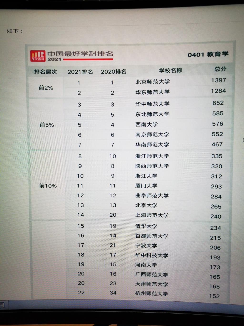 教育学科位列第12位,入围前8%。这是继2018年入围软科中国最好学科前10%以来,我校教育学科连续4年保持前10%,也是继2020年入围前8%以来,连续2年排位全国第12位。