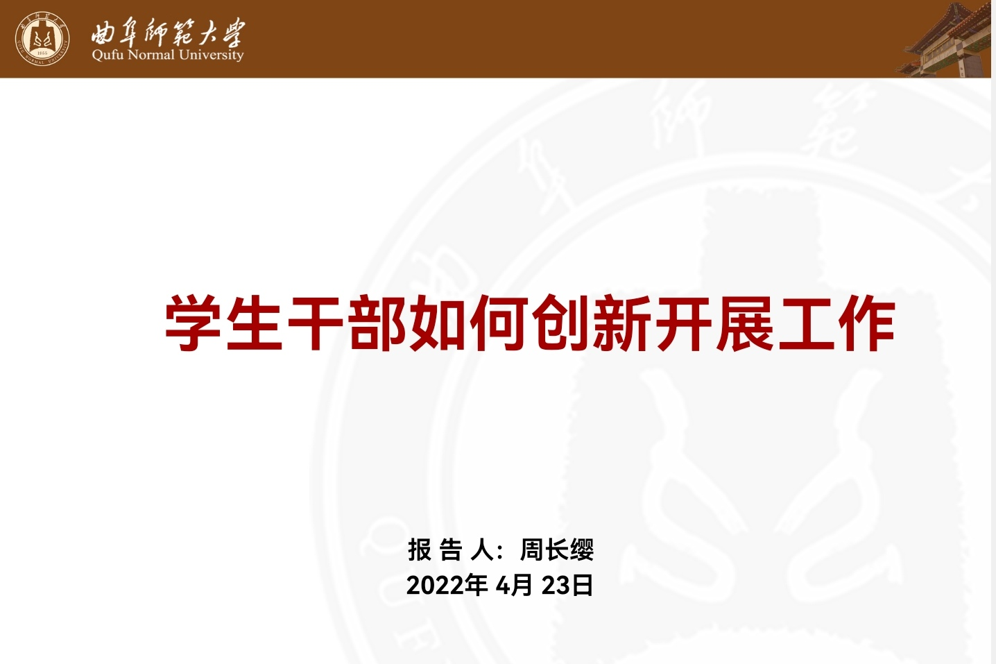周长缨老师围绕学生干部如何创新开展工作的话题展开。首先强调了学生干部要明确身份认同以及创新的两种方式。随后提出创新开展工作的三个度:高度、深度、广度,从三个不同的角度对如何创新开展工作进行全面具体的阐述,并提出了相应的意见与建议。