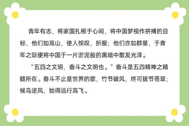本次征文比赛旨在传承五四精神,引导和激励广大青年牢记使命,深刻理解五四运动的历史意义和时代价值。本次比赛获得了同学们的热烈响应,参赛选手用生动的语言阐释作品创作的初衷和作品所体现的意义、内涵。经评选,王鸿茹荣获一等奖;颜廷艳、毕英洁、闫红晔荣获二等奖;孙文慧、倪汉卿、孟欣宇、赵欣、王鑫钰荣获三等奖。