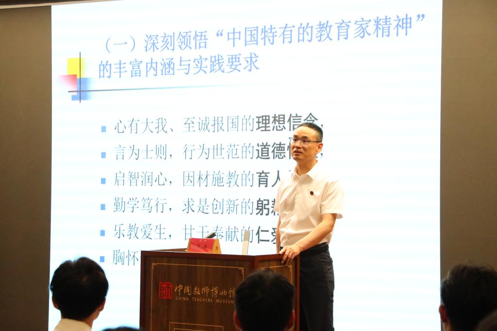 参观结束后,徐瑞教授以《践行教育家精神,争做新时代大国良师》为题,引古喻今,旁征博引,用大量生动案例阐述了教育家精神的丰富内涵与实践要求。此外,徐瑞教授还重点强调了“四有”好老师与教育家精神的内在联系,并鼓励同学们要以优秀教育家为榜样,践行教育家精神,做教育事业的笃行者。