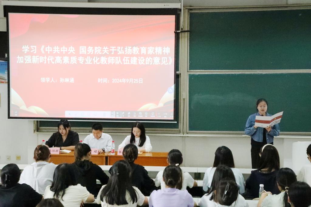 会议第一项,团委组织部副部长孙琳涵带领大家集体学习《中共中央国务院关于弘扬教育家精神加强新时代高素质专业化教师队伍建设的意见》,帮助大家深入学习和自觉践行教育家精神,指引在座的师范生树立“胸怀天下、以文化人”的弘道追求和崇高的教育理想。