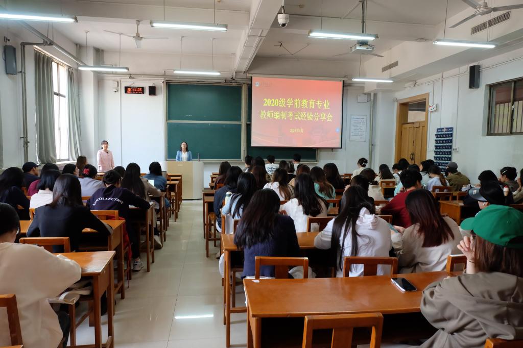 召开2024届学前教育专业就业推进暨教师编制考试经验分享会。毕业班辅导员曹亚楠、侯萍萍共同主持会议,2024届学前教育专业全体本科生参加会议。