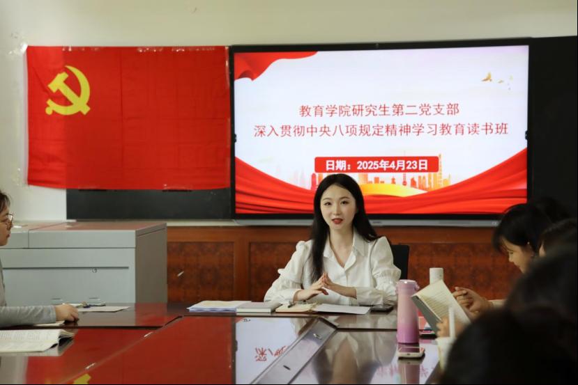 研究生第二党支部举办深入贯彻中央八项规定精神学习教育读书班,专题学习习近平总书记关于加强党的作风建设的重要论述。党支部书记谢依曈强调,中央八项规定是新时代全面从严治党的“铁规矩”,必须发扬党的优良作风,持之以恒落实中央八项规定精神,并要求全体党员以阅读促学、以研讨促行,推动纪律规矩意识入脑入心。