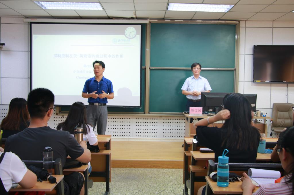 会议伊始,何文广副院长对陈宝国教授进行了介绍并表示热烈欢迎。陈宝国教授主讲的“抑制控制在汉—英双语转换过程中的作用”,对英—汉双语者通过抑制控制机制实现语言选择进行了精到的分析。他的报告围绕大学生感兴趣的话题进行,引起同学们的强烈共鸣,通过介绍四个实验研究加深了同学们对抑制控制的了解。陈教授在讲座结束后与学生积极互动交流,展开热烈讨论,认真专业地解答同学们的疑惑。