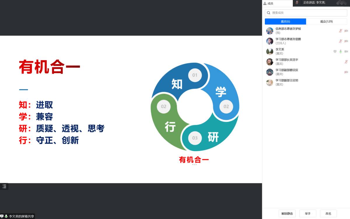学生带来题为《立足当下、放眼世界,知学研行、有机合一》的学术报告。