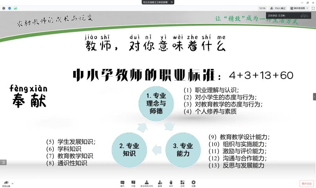 报告会上,王立新老师分别从职场、教师对师范生的意义、教师的基本素养和个人工作经历等方面进行了细致的讲解,阐述了教师职业背后蕴含的深刻意义。