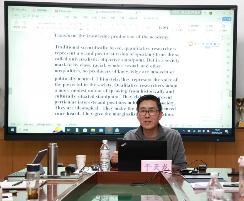 首先,于天龙教授明确指出质性研究是情境化的活动,需要研究者将研究对象置于真实环境之内,在自然环境中观察。随后,于教授阐述了进行质性研究的缘由,并强调质性研究不仅聚焦于社会构建性质、研究者与被研究者之间的密切关系以及情景控制对研究过程的影响,还特别关注之前被社会忽略的群体,从而能够解决量化研究所无法解决的问题。最后,于教授同与会师生就质性研究是否可以保持中立态度、对小规模群体开展质性研究是否具有说服性等问题进行了现场答疑与深度研讨。